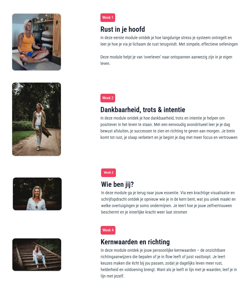De komende vier weken neem ik je stap voor stap mee naar meer rust, bewustzijn en regie over je leven. Je leert beter luisteren naar je lichaam, de kracht van dankbaarheid ervaren en weer verbinding maken met wie jij écht bent.